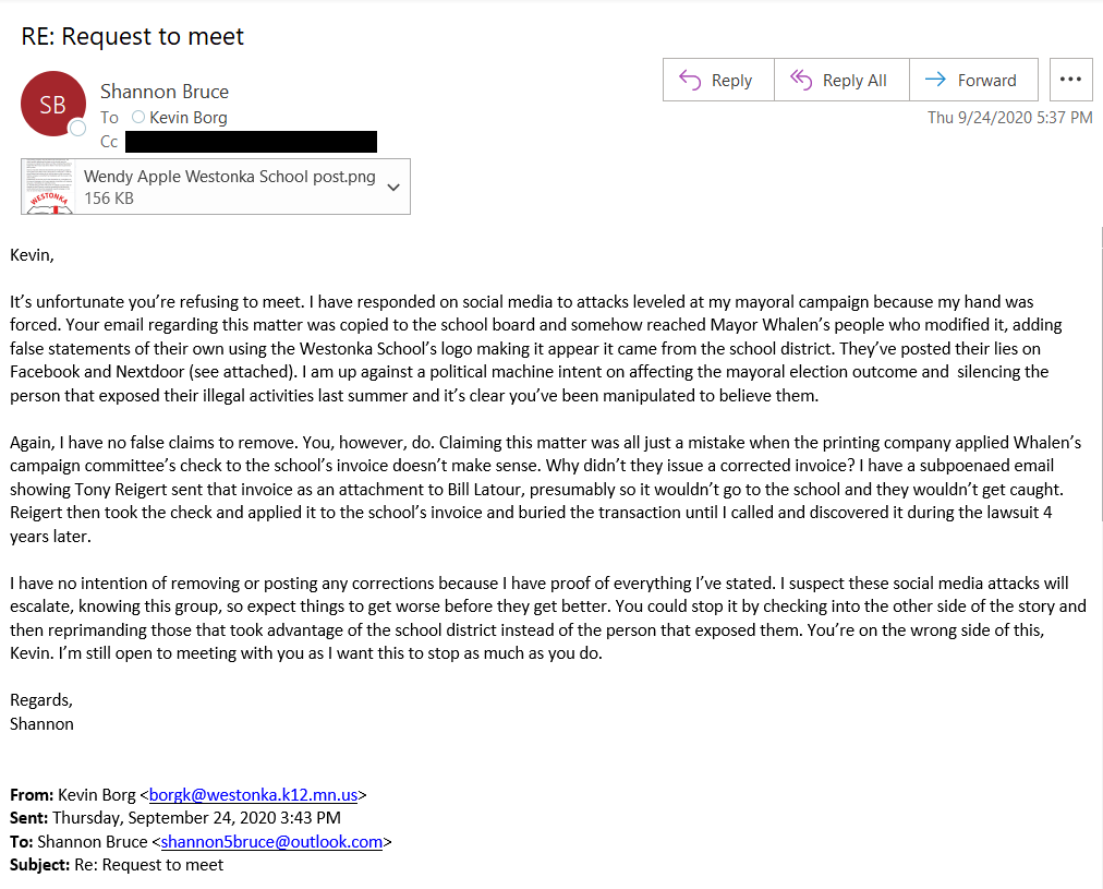 2. Now, four years after the transaction and voting has begun for the mayoral election, Whalen’s campaign is claiming I’ve made false statements, along with the Superintendent of Westonka Schools who has chosen to refuse my request to meet with him to show the evidence.