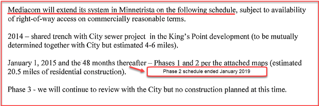 Please don’t call city hall if you live in the Phase 2 circle, like I do, and don’t have service. Mediacom has not extended its system where contractually obligated and the city needs to hold them accountable with fines until they do. Those fines should have started in January 2019. If they had we likely would have service to these areas by now.