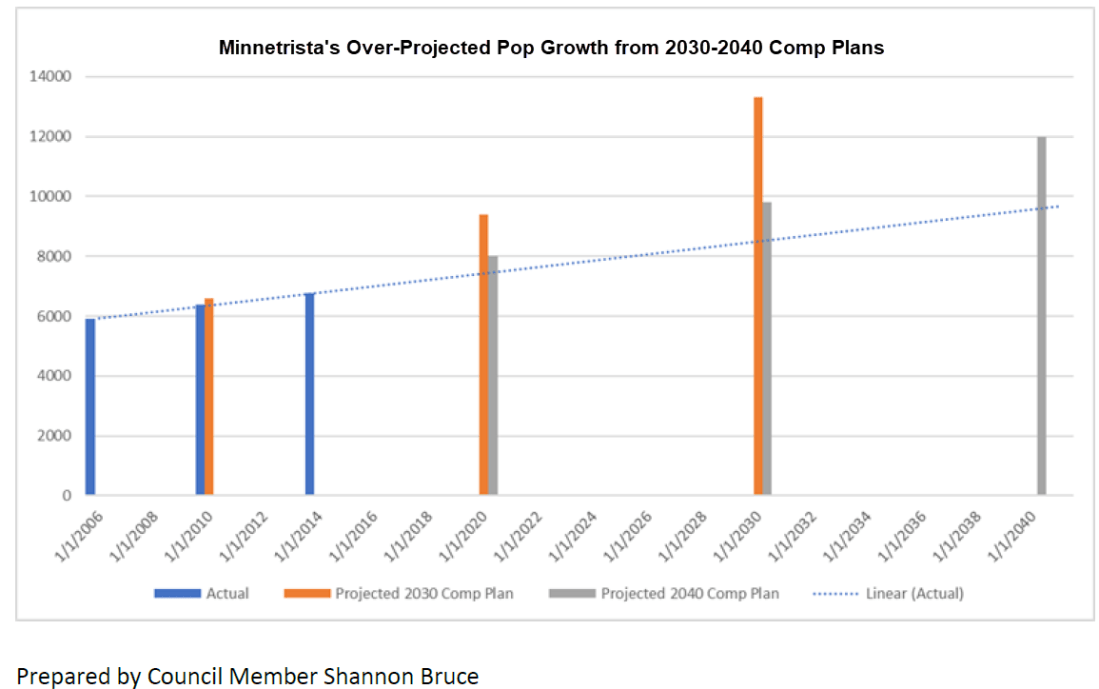 1. Minnetrista’s new 2040 Comprehensive plan shows a total number of municipal water connections in 2015 as 1,648 but the commissioned study shows far fewer connections at 1,245 in 2015. We should have accurate data from 2015. Why are these numbers so different? When I see discrepancies like this it doesn’t give me confidence in our growth projections.